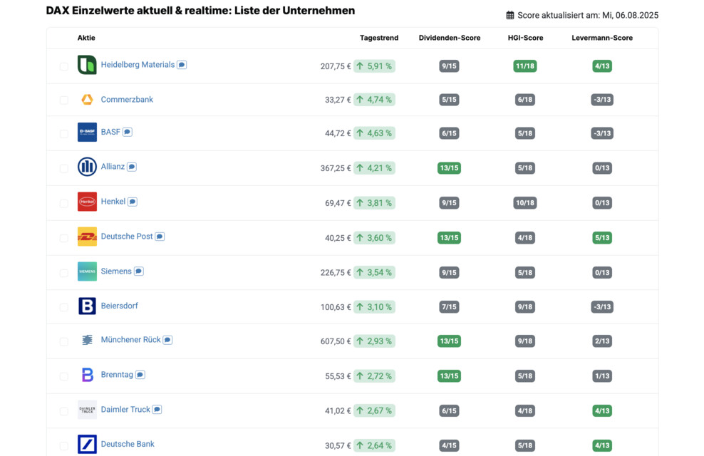 | Aktie | Tagestrend | Dividenden-Score | HGI-Score | Levermann-Score |