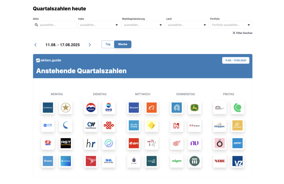 Die Quartalszahlen dieser Woche findest Du heraus, wenn Du auf Woche klickst. So erhältst Du eine Übersicht von allen Aktien, die diese Woche Quartalszahlen veröffentlichen. So lassen sich die Termine des Quartalszahlen Kalenders auf eine bestimmte Woche eingrenzen. Mit den folgenden Links gelangst Du zu voreingestellten Ansichten: